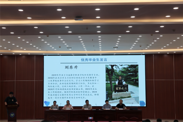首先,多位优秀学生代表为即将奔赴实习岗位的2022级学生做经验分享。2021级优秀学生代表陈一泽分享了在河南省洛阳正骨医院的实习经历,鼓励学弟学妹在临床中要多看、多问、多学、多悟,不怕吃苦,勇挑重担,才能不断成长和进步。2019届优秀毕业生代表刘东升回顾了在基层社区医院的工作情况,并讲述了自己在工作中坚持学习考取安徽中医药大学研究生的心路历程,勉励学弟学妹持续学习,勇攀高峰。2022级优秀学生代表尤鑫彤发言,表达了对实习生活的期待及不畏挑战的信心。随后,针灸推拿系实习就业办王松强老师开展就业工作培训,从就业规划、就业协议签订、就业数据上报等方面为同学们进行答疑解惑。针灸推拿系主任张占栋为大家送上寄语期望,希望同学们在实习岗位上牢记医者初心,不断提升专业技能,多为患者着想,不负白袍荣光,要迅速完成角色转变,从容应对实习挑战,时刻牢记安全第一。最后,2022级全体学生重温医学生誓言。