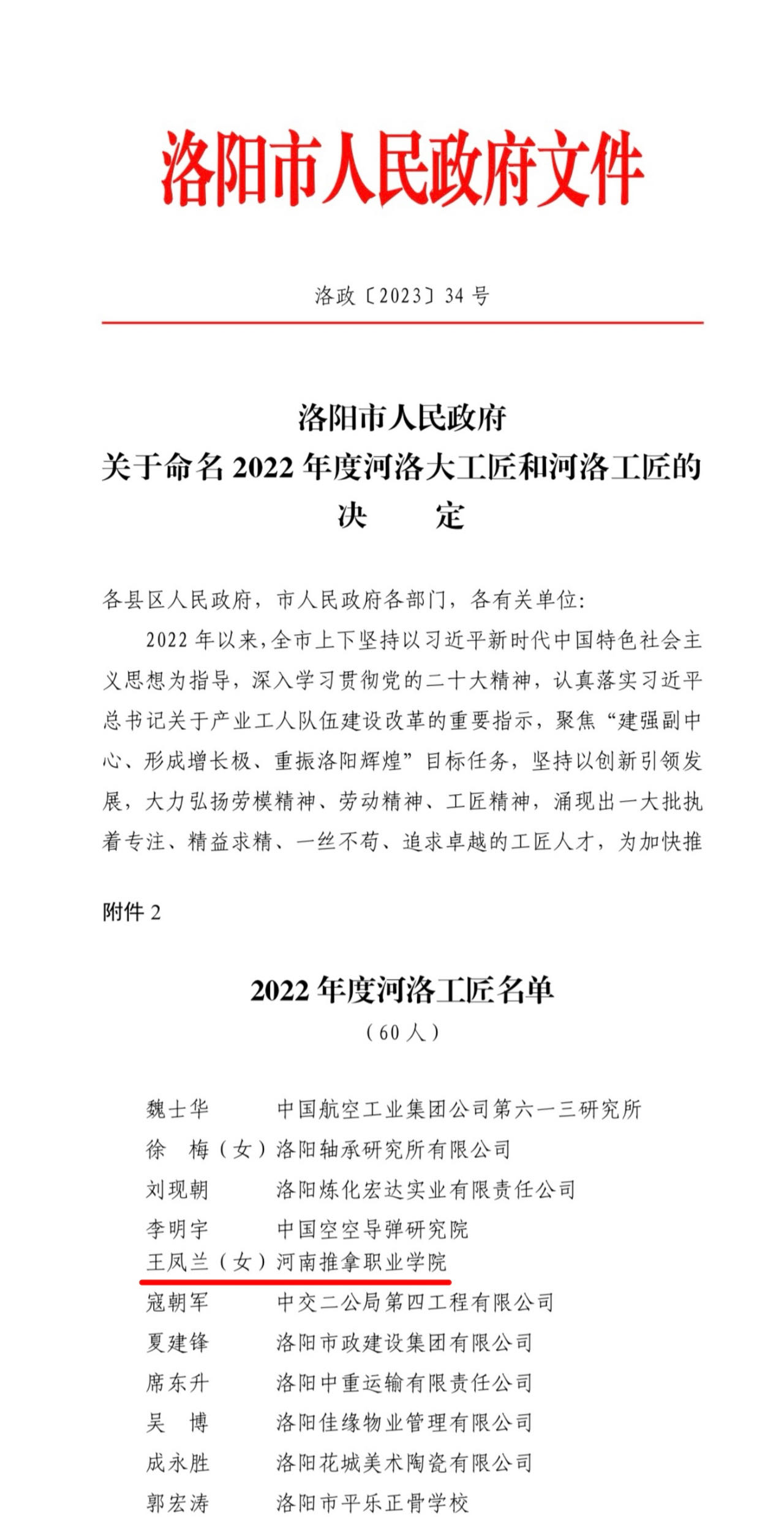日前,洛阳市人民政府下发《关于命名2022年度河洛大工匠和河洛工匠的决定》洛政〔2023〕34号,我系王凤兰老师荣获“河洛工匠”称号。