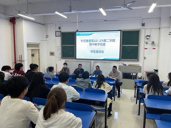 为进一步加强教风学风建设,加强教师和学生的交流,5月8日下午,我系在第9阶梯教室召开“针灸推拿系2022-2023学年第二学期期中教学检查学生座谈会”。系部领导,21级、22级各班学生代表参加座谈,会议由系教学办主任刘锋老师主持。