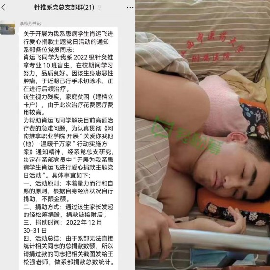 肖运飞同学的不幸遭遇引起全校师生的关注和同情,针灸推拿系党总支在了解到相关情况后,领导班子高度重视马上开展救助行动。所在班级第一时间为他向学校申请临时困难补助2000元,解决肖运飞同学的燃眉之急;系党总支开展“爱心点燃希望 真情传递温暖”募捐活动,党员和入党积极分子线上捐款2130元;动员师生转发朋友圈扩大社会面捐助力度。学院组织人事处等其他部门教职工和任课教师也纷纷向肖运飞同学捐款、慰问。肖运飞所在班级的同学们也以各种形式为肖运飞同学加油鼓劲,希望他能够战胜病魔早日回归校园!
