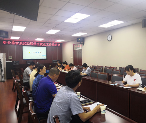 8月9日,针灸推拿系在行政二楼视频会议室召开2022届毕业班第五次就业工作推进会,会议采取线上线下同步进行,学院联系毕业班的中层干部、系部班子成员、2022届毕业班辅导员及就业相关工作专员参加会议。会议由张占栋主任主持。