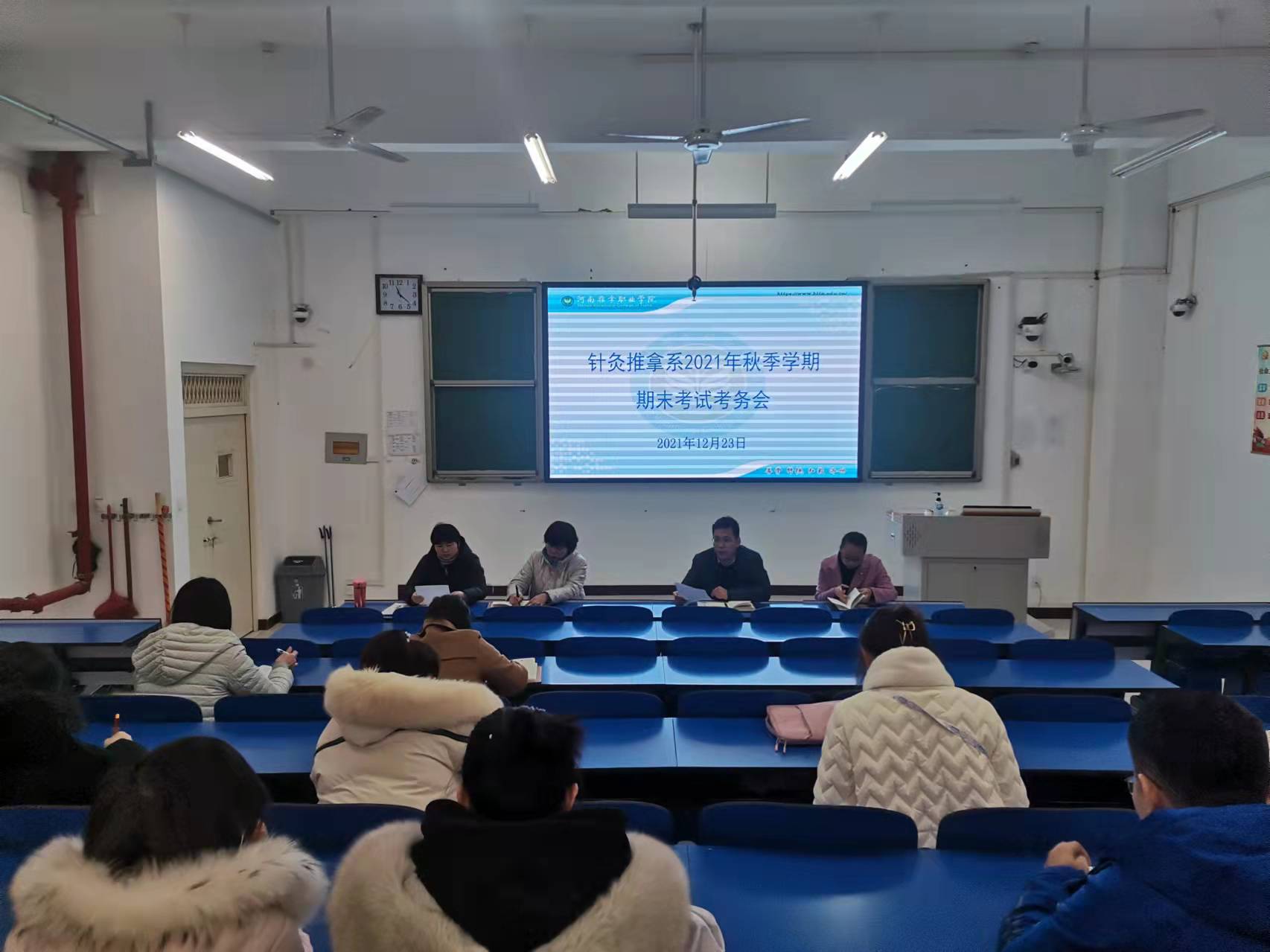 为确保期末考试顺利进行,严肃考试纪律,营造公平、公正的考试环境,2021年12月23日上午,针灸推拿系在第9阶梯教室召开2021年秋季学期期末考试考务会。针灸推拿系负责人出席会议,全体教职工参加会议。
