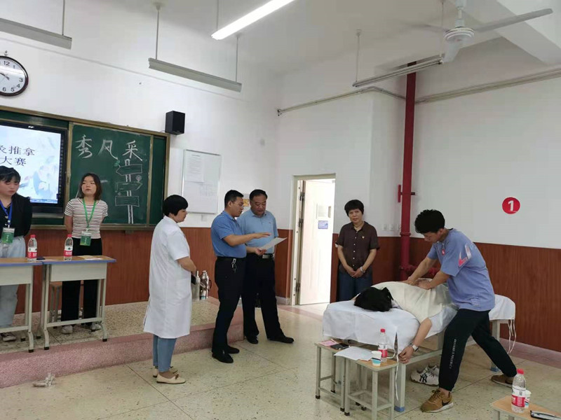 为贯彻国务院关于加快发展现代职业教育的决定,进一步推进以赛促学、以赛促教,创新实践教学体系,加强学生人文素质、提高学生针灸推拿基本技能,5月29日-30日,针灸推拿系在综合教学楼举行2021年针灸推拿基本技能大赛。学院党委书记韦保新同志、教务处处长吴涛同志亲临现场并指导比赛。
