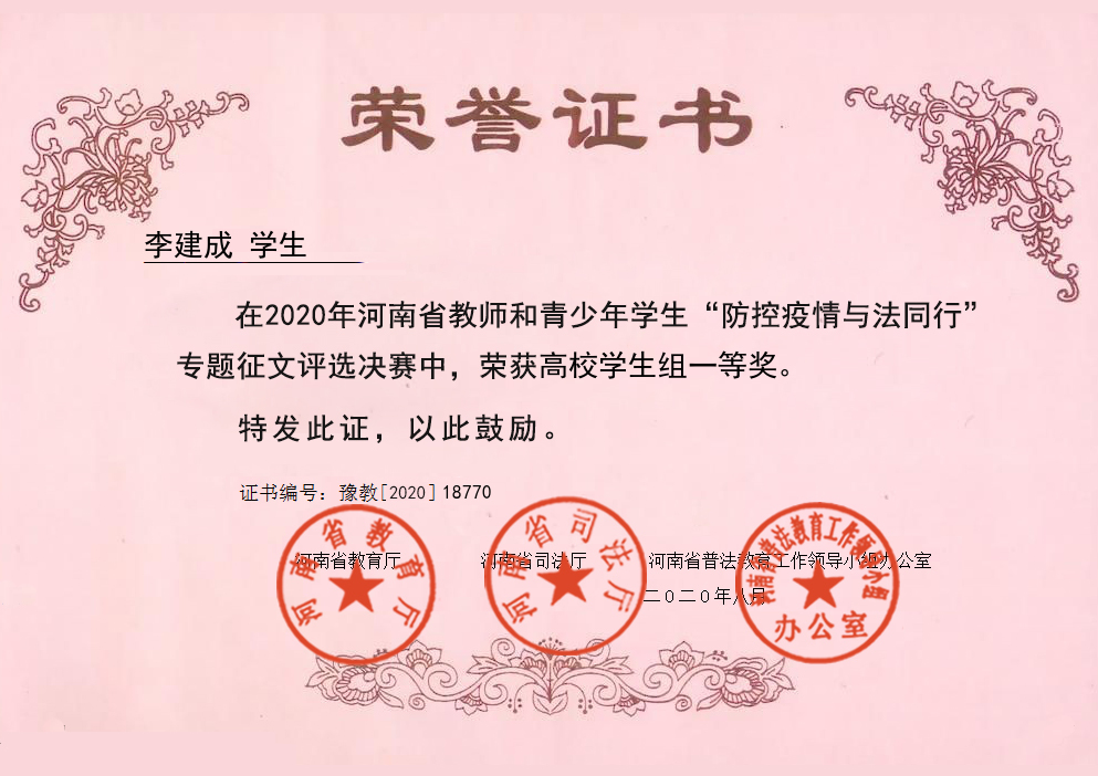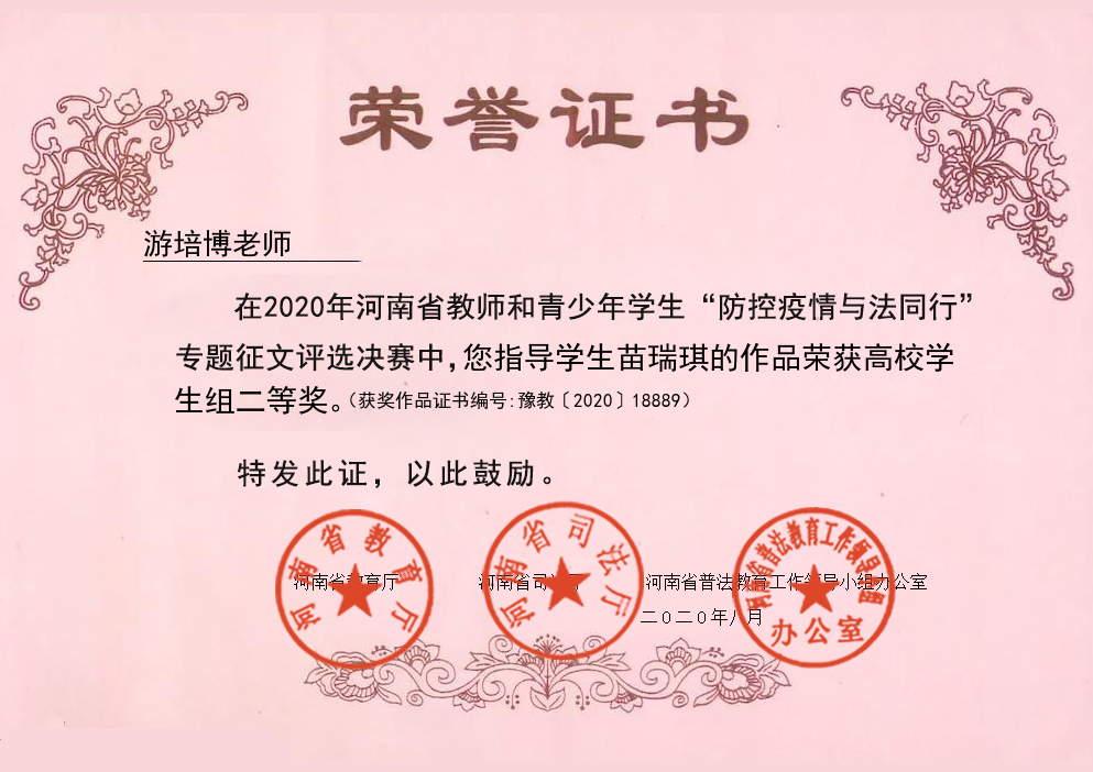 与法同行’专题征文活动获奖名单的通知》(教政法〔2020〕308号),我系共有8篇作品获奖。其中,游培博老师、李建成同学分别获得高校教师组、高校学生组一等奖,张丹峰老师获得高校教师组二等奖,王琦等5名同学分别获得大学生组二、三等奖。