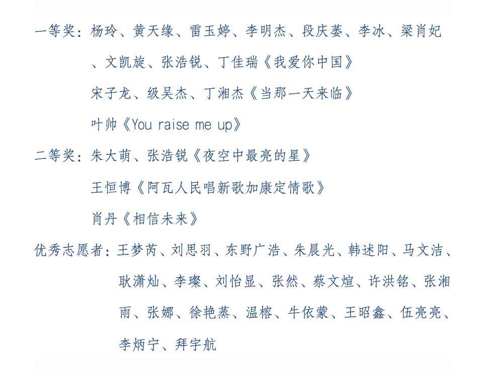 据了解,我系在本次汇演中共获一等奖3项、二等奖3项,21名学生荣获“优秀志愿者”称号。