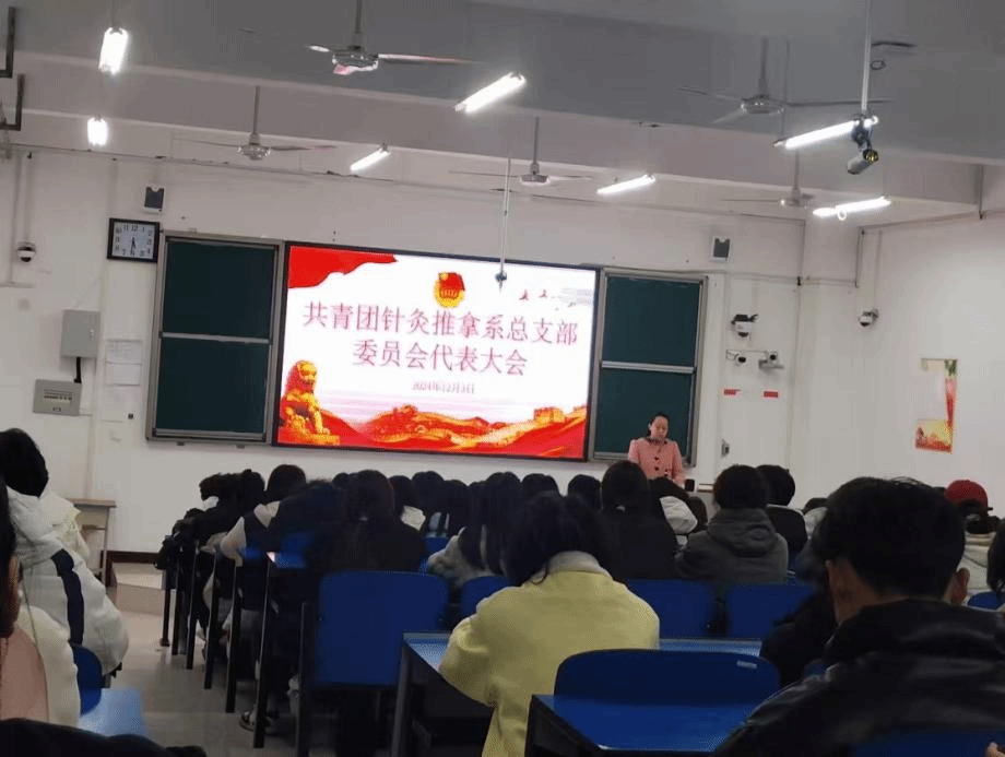 2024年12月3日共青团针灸推拿系总支部委员会代表大会在综合楼第九阶梯教室顺利召开。针灸推拿系团总支部书记夏征老师、针灸推拿系副主任陈蓉老师、系部各班团支书以及各班团员代表参加本次会议,会议由夏征老师主持。