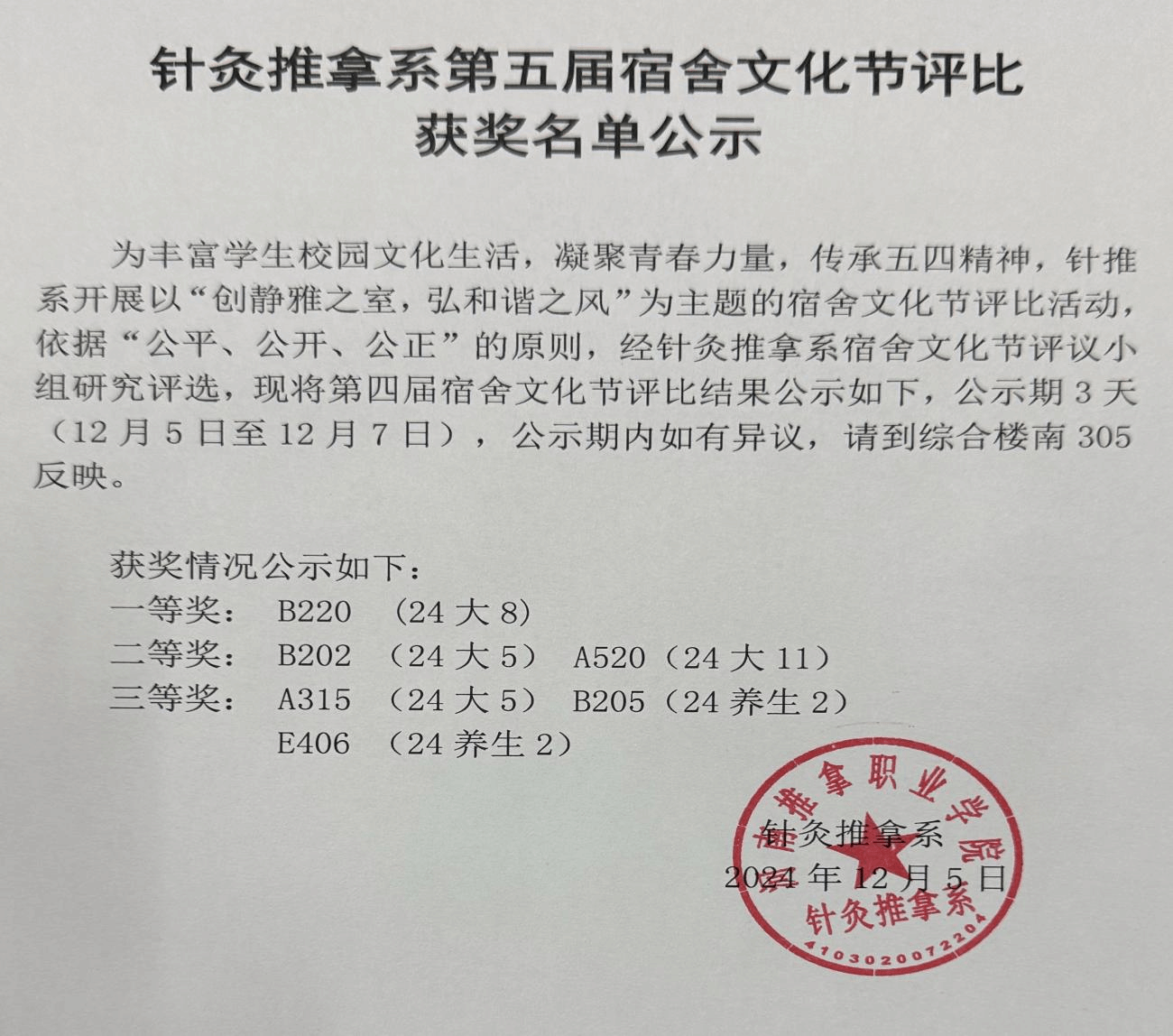 为提升校园文化建设,丰富学生校园文化生活,凝聚青春力量,传承五四精神,提高同学团结合作能力,共创文明宿舍。针灸推拿系于11月份开展“创静雅之室,弘和谐之风”为主题的宿舍文化节活动。通过本次活动,引导学生构建一个整洁、舒适、和谐的宿舍环境,增强同学们的交流互动,培养了团队合作精神,提升宿舍群体的凝聚力和向心力,营造和谐温馨的居住氛围,进而体现同学们积极向上的生活态度,展现生活风貌,加强同学们对宿舍的归属感,参与感。