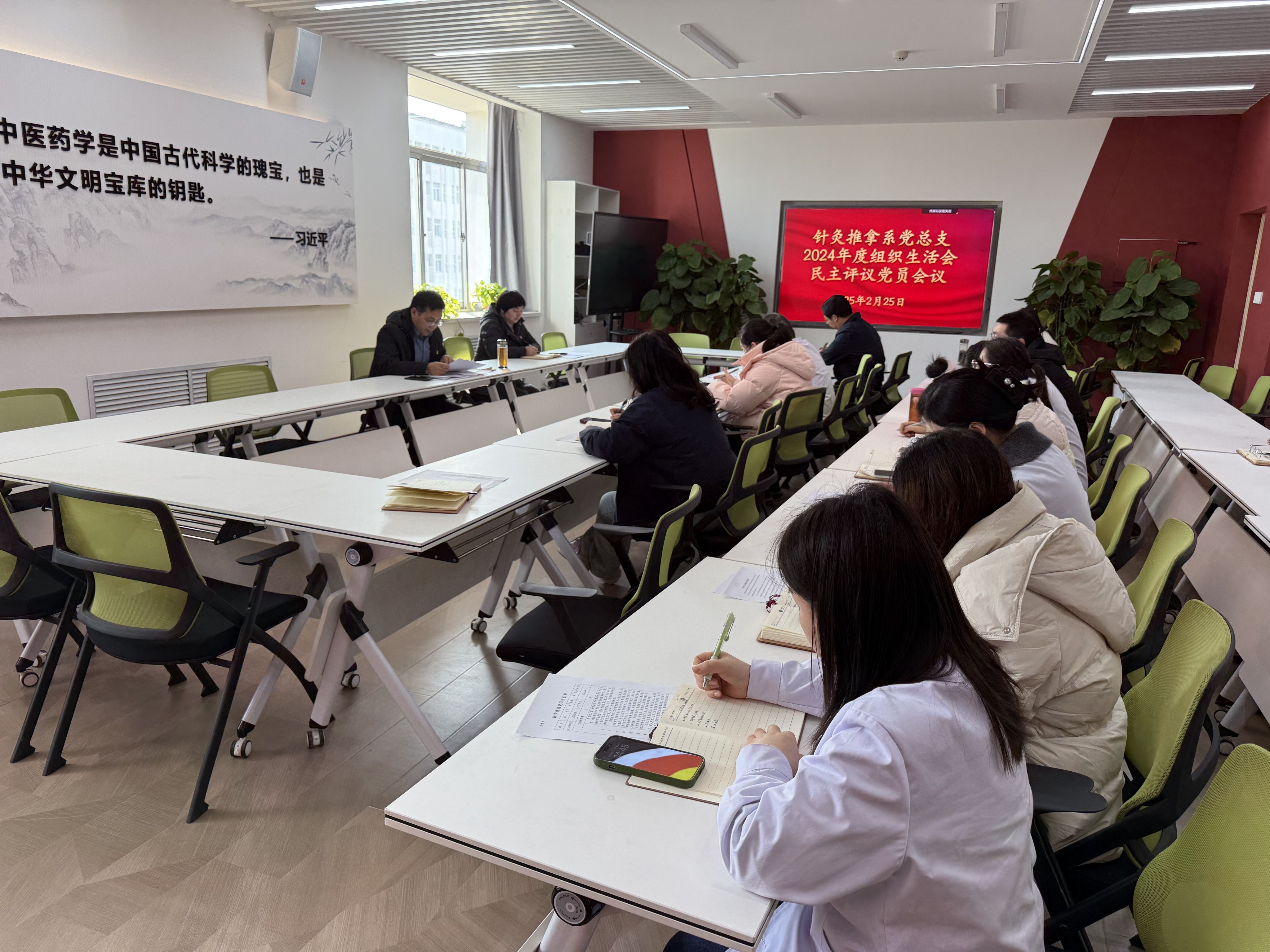 根据学院《关于开好2024年度基层党组织组织生活会和开展民主评议党员工作的通知》要求,针灸推拿系党总支高度重视,精心筹备,于2月25日下午在综合楼316会议室成功召开了2024年度组织生活会及民主评议党员会。会议由党总支副书记张占栋主持,旨在深入学习党的先进理论,总结党建工作成果,进一步提升党员队伍的整体素质和战斗力。