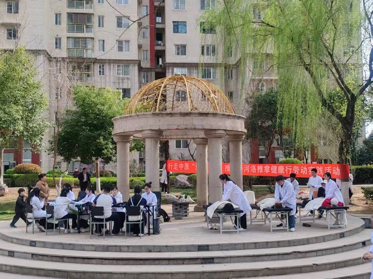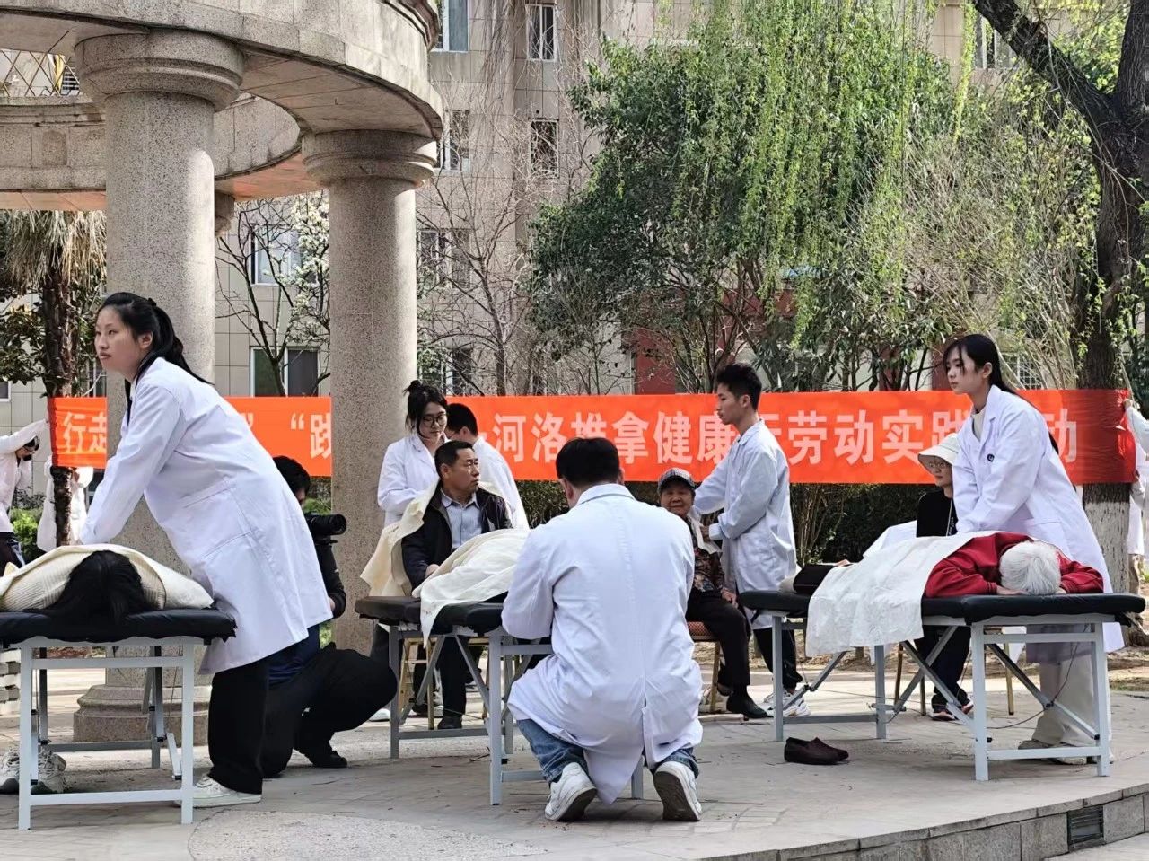 3月22日,春分时节,河洛推拿弘济社与蒲公英医学社携手,将思政课堂延伸至社区一线,在洛龙区红太阳花园小区开展"雷锋月"健康志愿服务,30余名师生以"技术服务+思政育人"双模式,为200余位居民送去春日健康关怀,用实际行动诠释新时代青年的责任与担当。