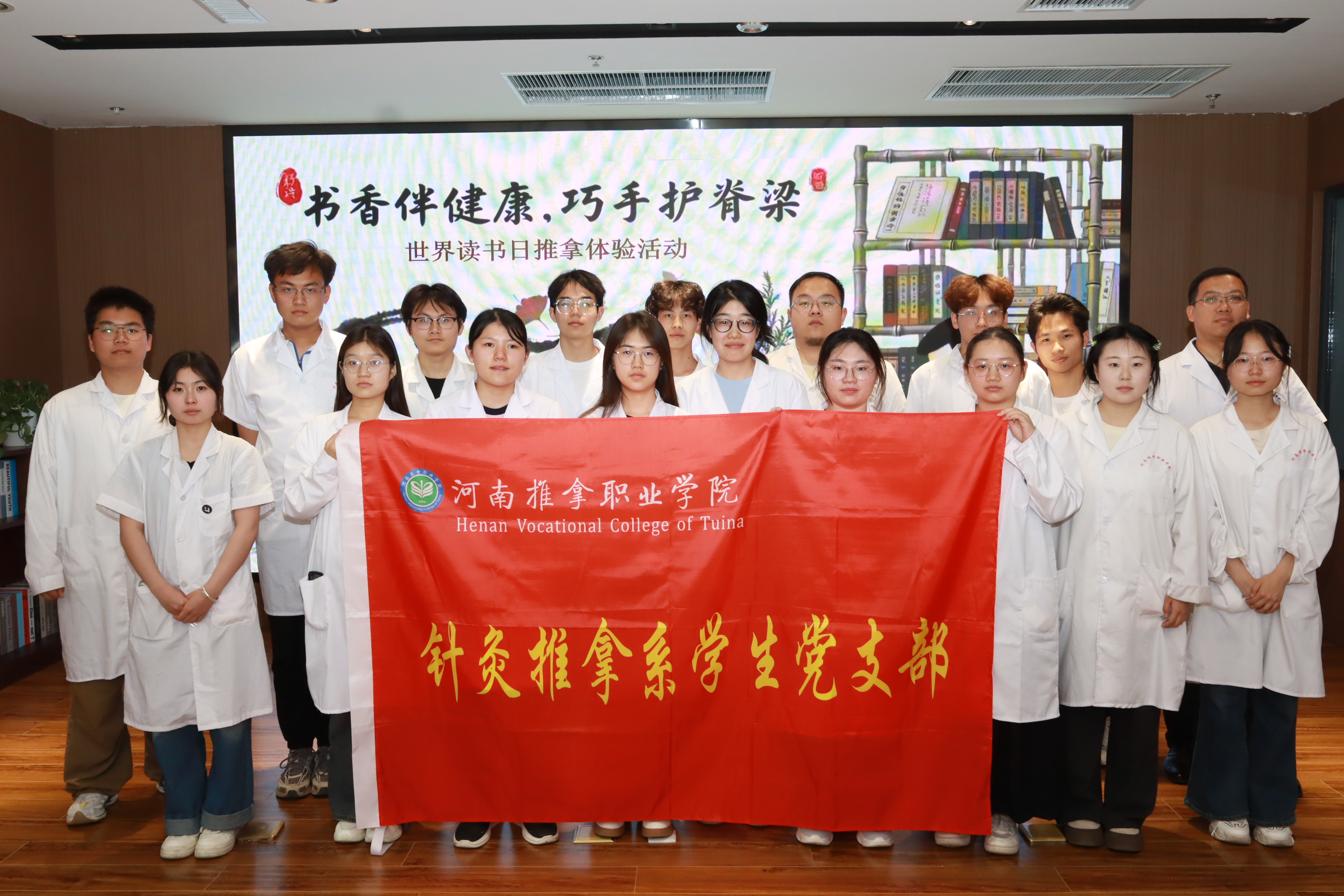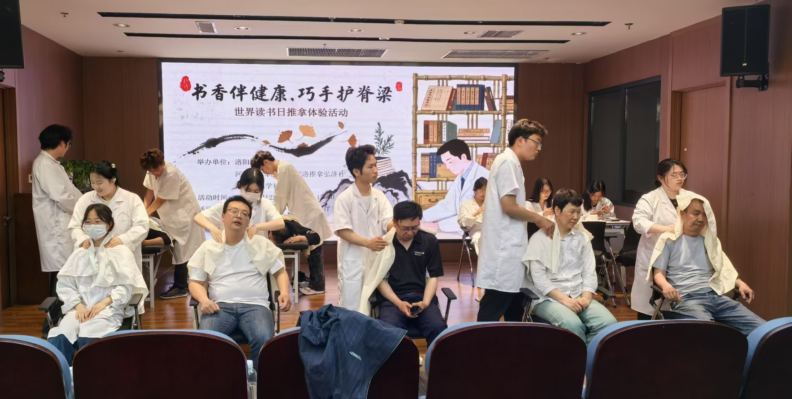 在第30个世界读书日即将来临之际,为倡导健康阅读理念,关心读者身心健康,4月22日下午,针灸推拿系学生党支部携手洛阳市图书馆,在洛阳市图书馆第三报告厅共同举办了“书香伴健康,巧手护脊梁”义诊志愿服务活动,为读者们带来了一场融合知识与健康的暖心体验。