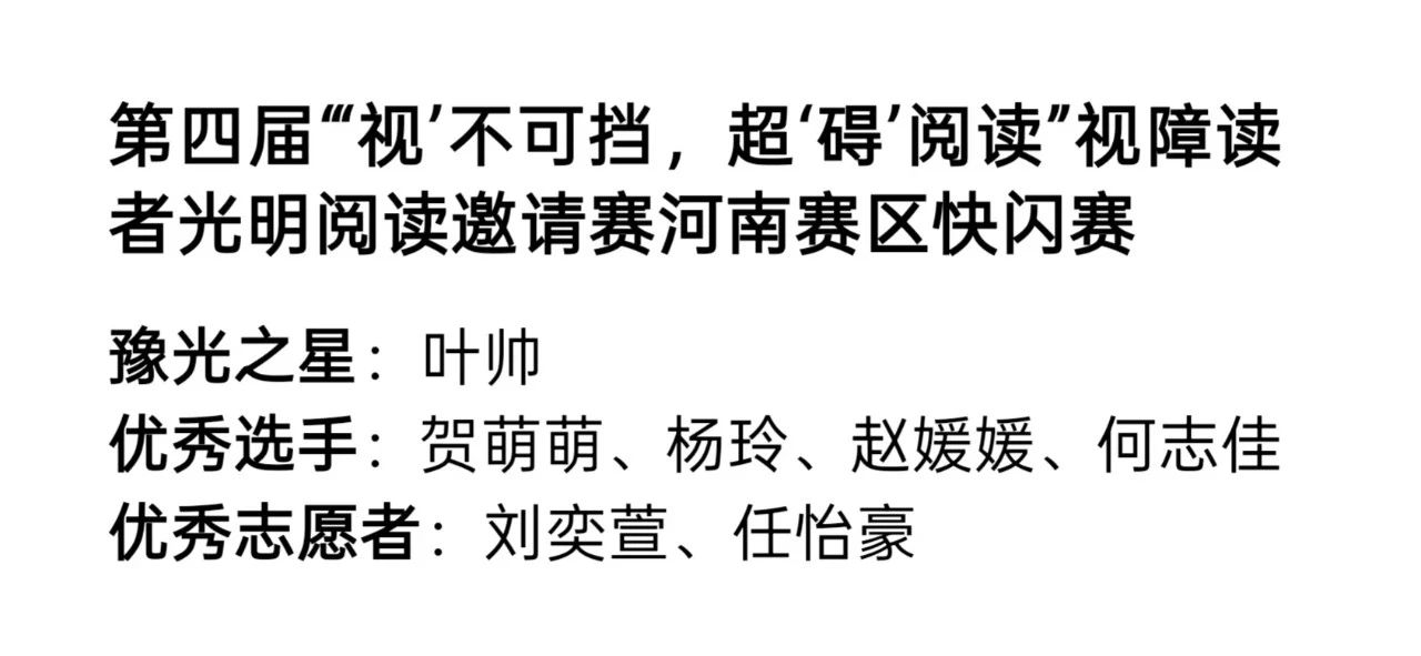 在第35个全国助残日到来之际,第四届“‘视’不可挡,超‘碍’阅读”视障读者光明阅读邀请赛河南赛区快闪赛于5月17日在河南省图书馆隆重举行。本次活动由河南省图书馆、河南省盲人协会、中国盲文图书馆与盲同行志愿服务中心支馆共同主办,旨在通过阅读竞技展现视障群体潜能,传递社会关怀。我系5名视障学子、2名志愿者在比赛中表现亮眼,共斩获“豫光之星”“优秀选手”“优秀志愿者”等七项荣誉,彰显特殊教育成果。