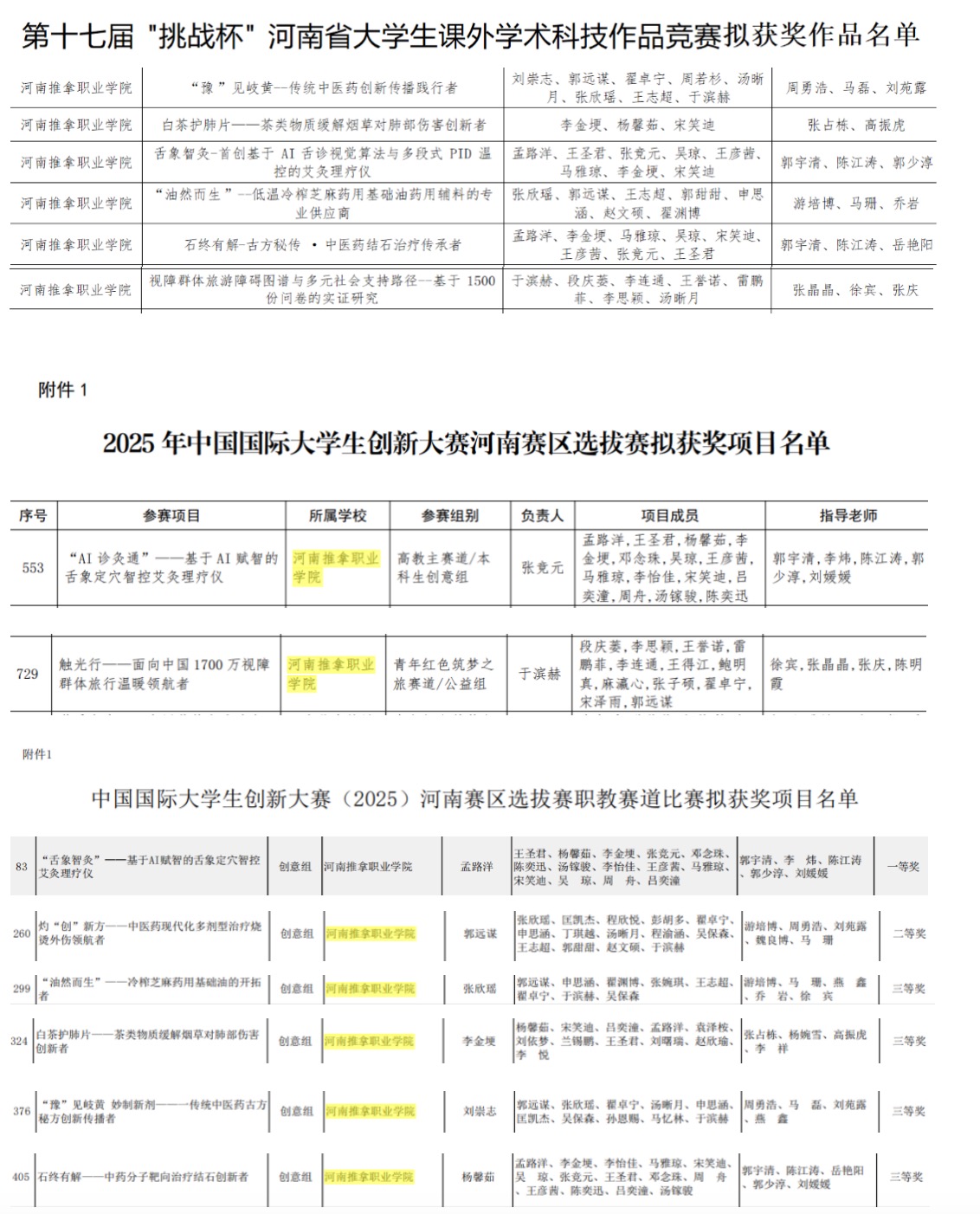 近日,中国国际大学生创新大赛(2025)河南省赛及第十七届“挑战杯”河南省大学生课外学术科技作品竞赛成绩相继揭晓。针灸推拿系学子凭借在“中医药现代化”、“AI+中医理疗”、“传统古方活化”及“视障群体服务”等多个领域的创新项目脱颖而出,累计荣获一等奖2项、二等奖1项、三等奖11项,充分展现了该系学子扎实的专业功底、卓越的创新能力与深厚的人文关怀,是学院“善学、修德、弘毅、济世”校训精神的生动实践。