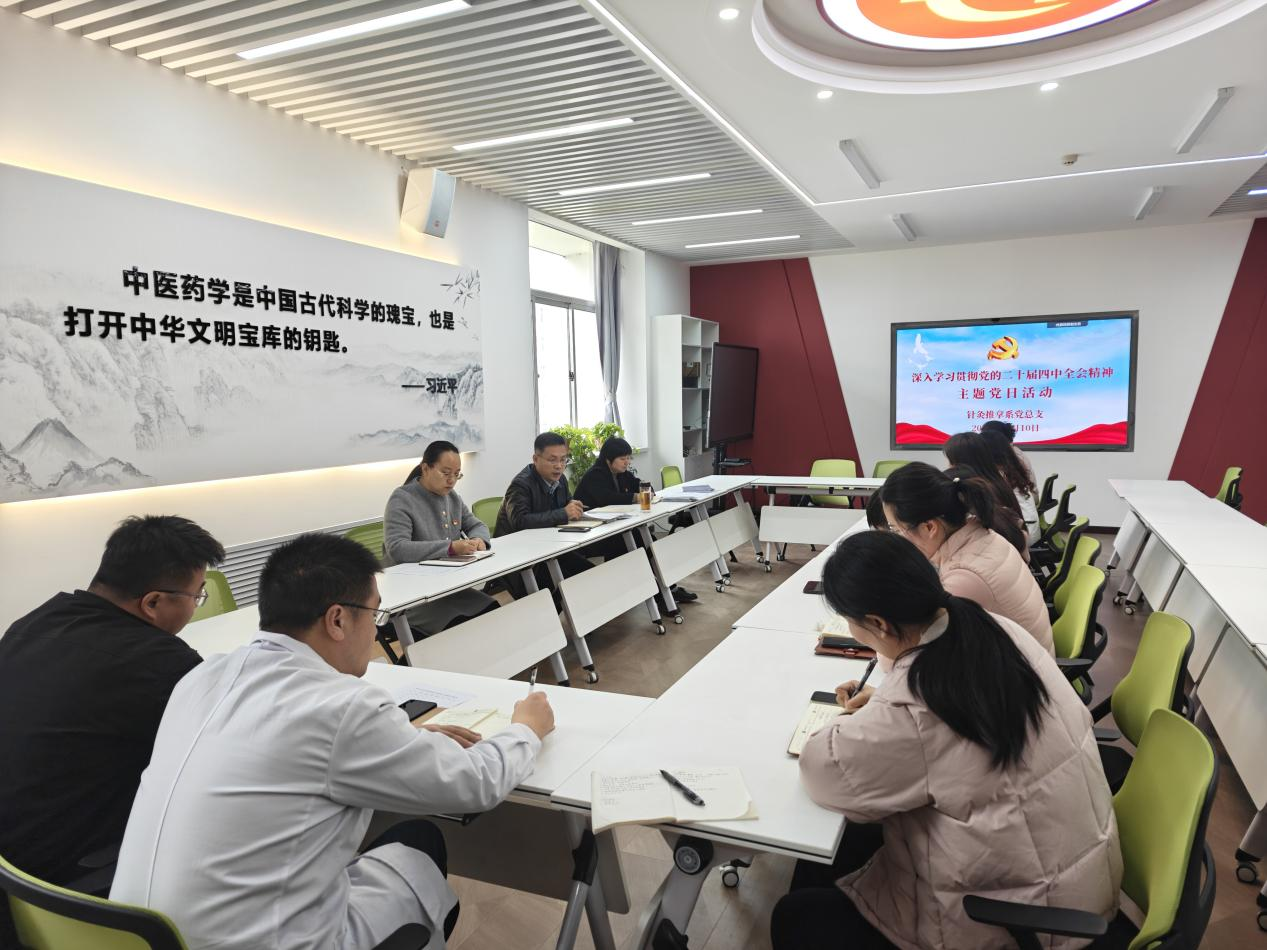 11月10日下午,针灸推拿系党总支组织全体党员开展“深入学习贯彻党的二十届四中全会精神”主题党日活动,以理论学习强党性、以思想引领促发展。会议由党总支副书记张占栋主持。