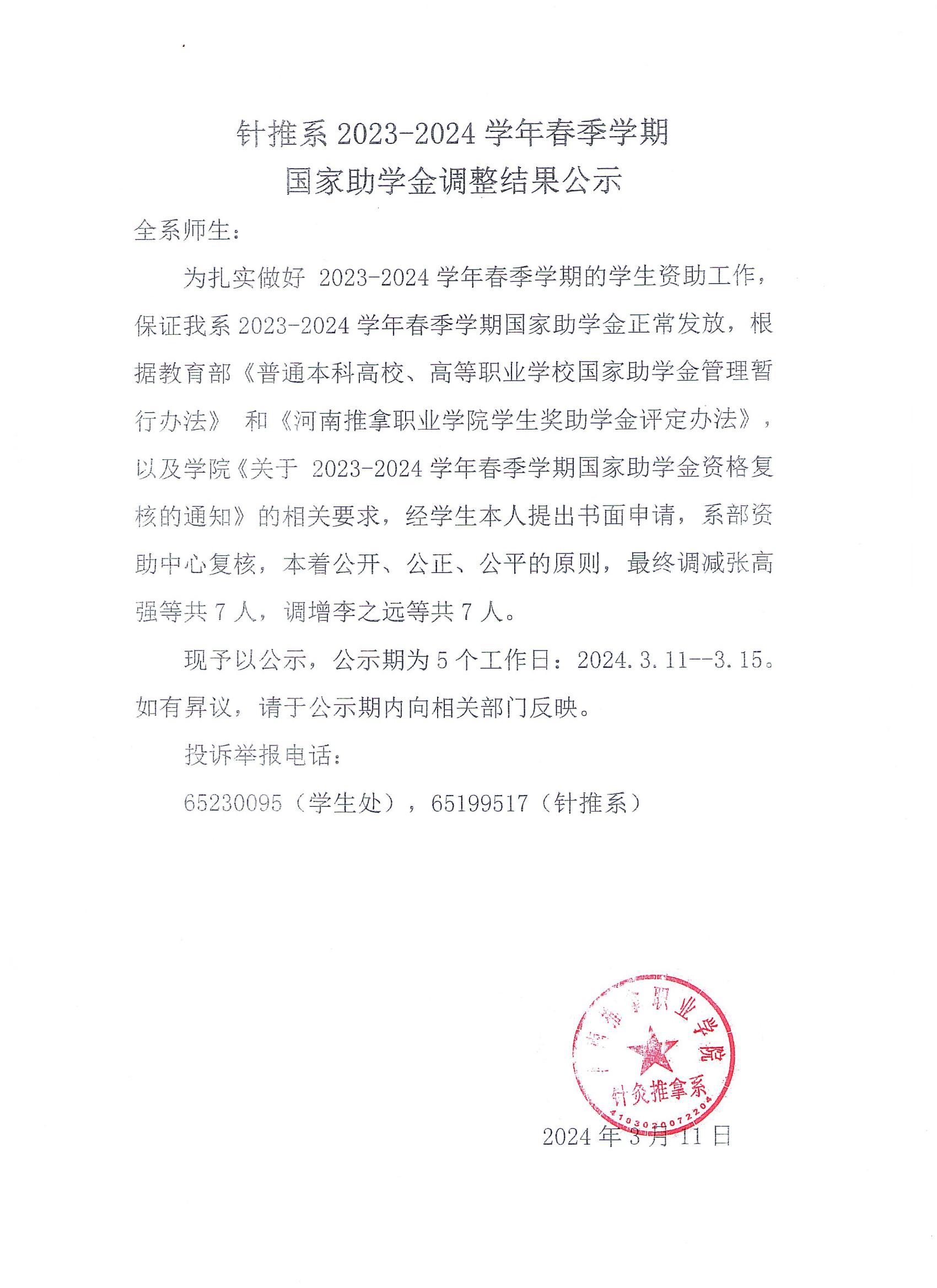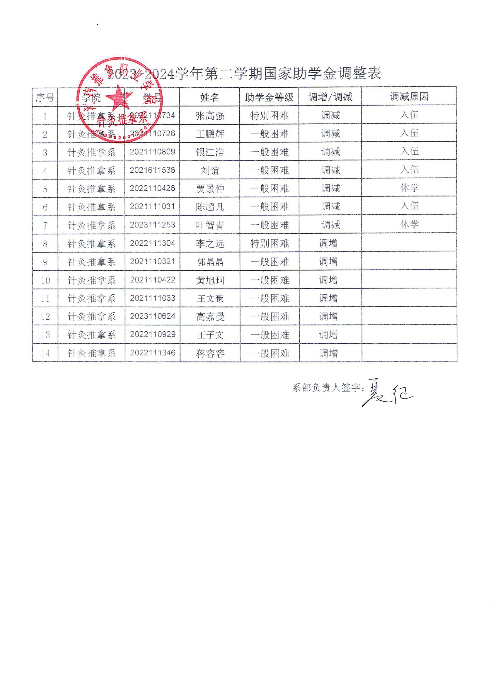 针推系2023-2024学年春季学期国家助学金调整结果公示