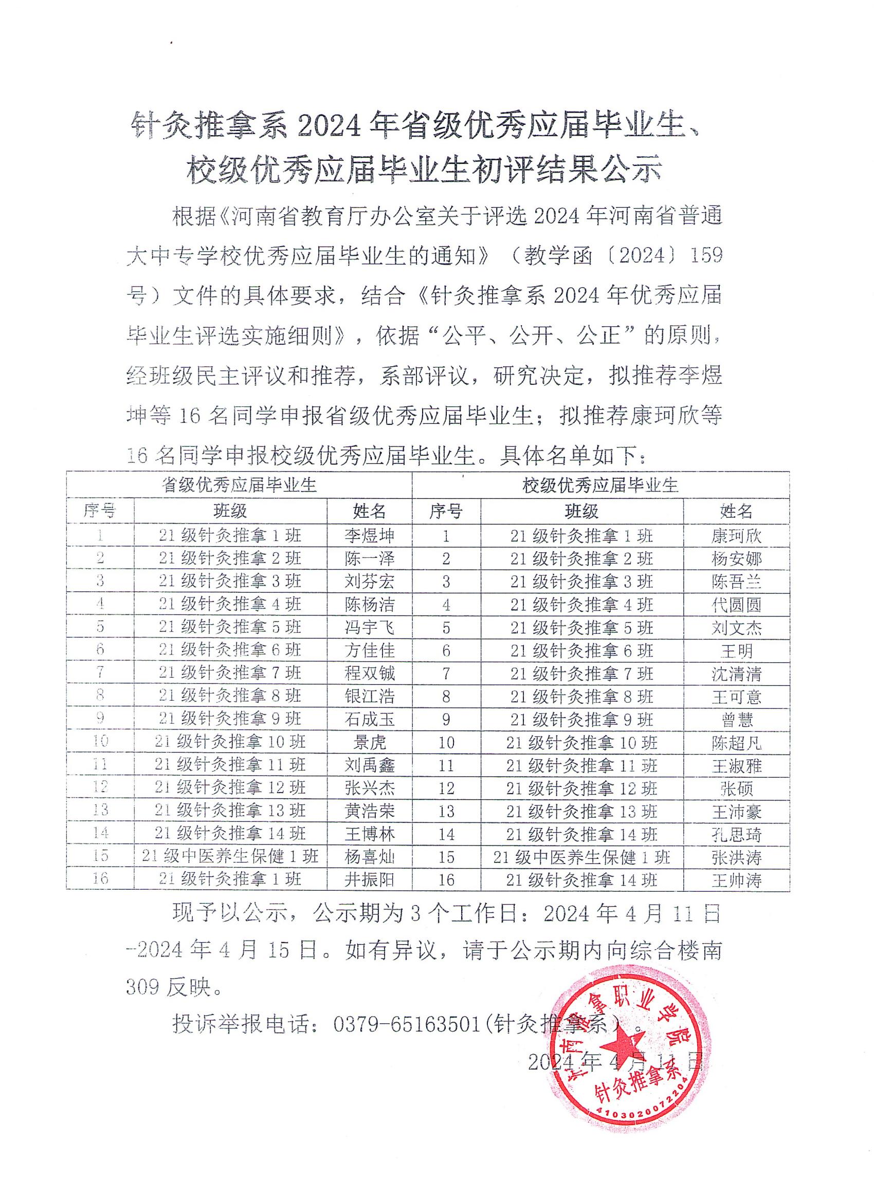 针灸推拿系2024年省级优秀应届毕业生、校级优秀应届毕业生初评结果公示