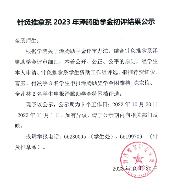 针灸推拿系2023年泽腾助学金初评结果公示