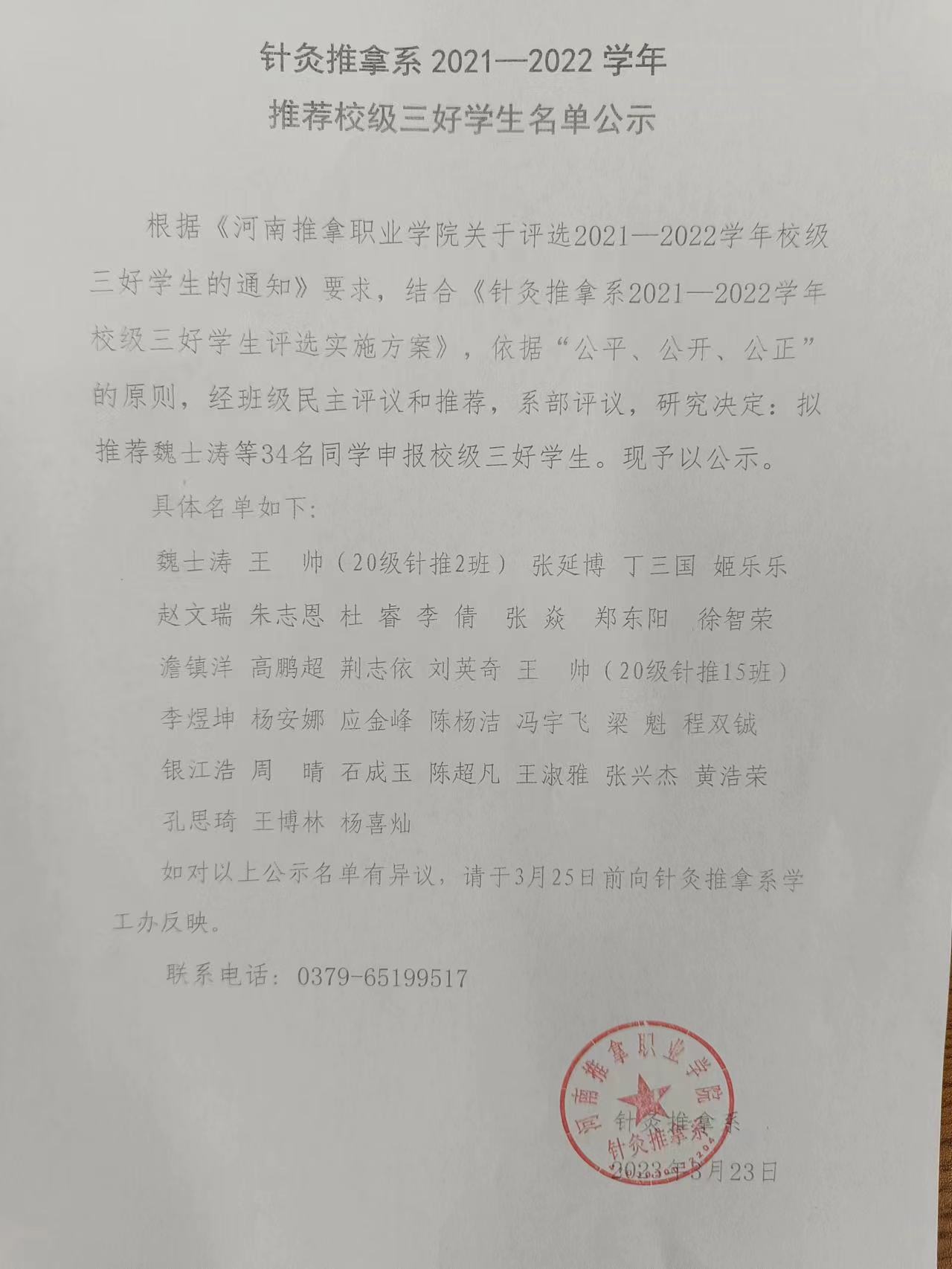针灸推拿系2021-2022学年推荐校级三好学生名单公示