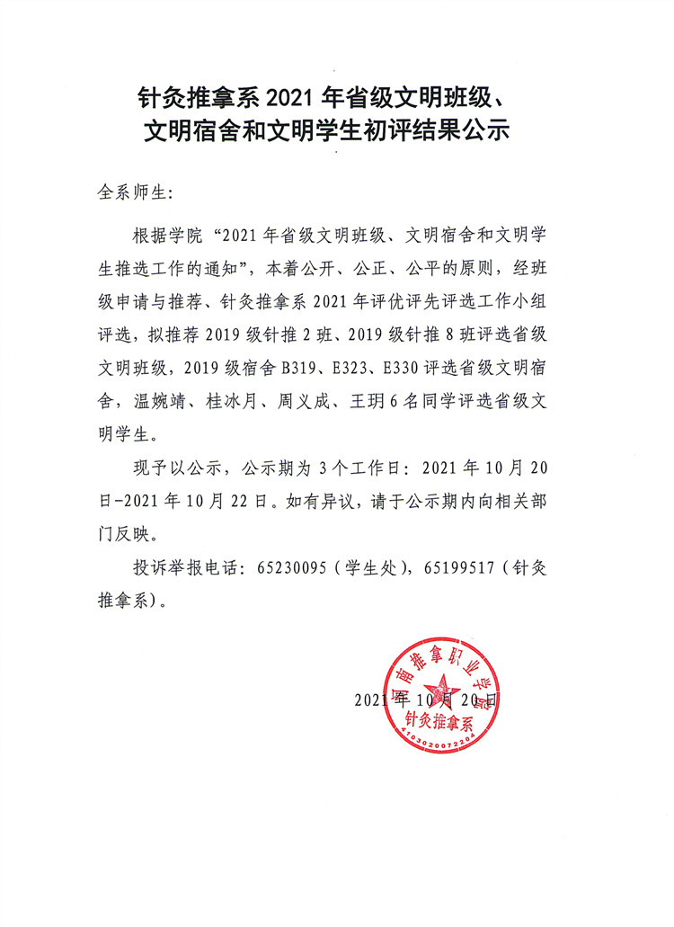 针灸推拿系2021年省级文明班级、文明宿舍和文明学生初评结果公示