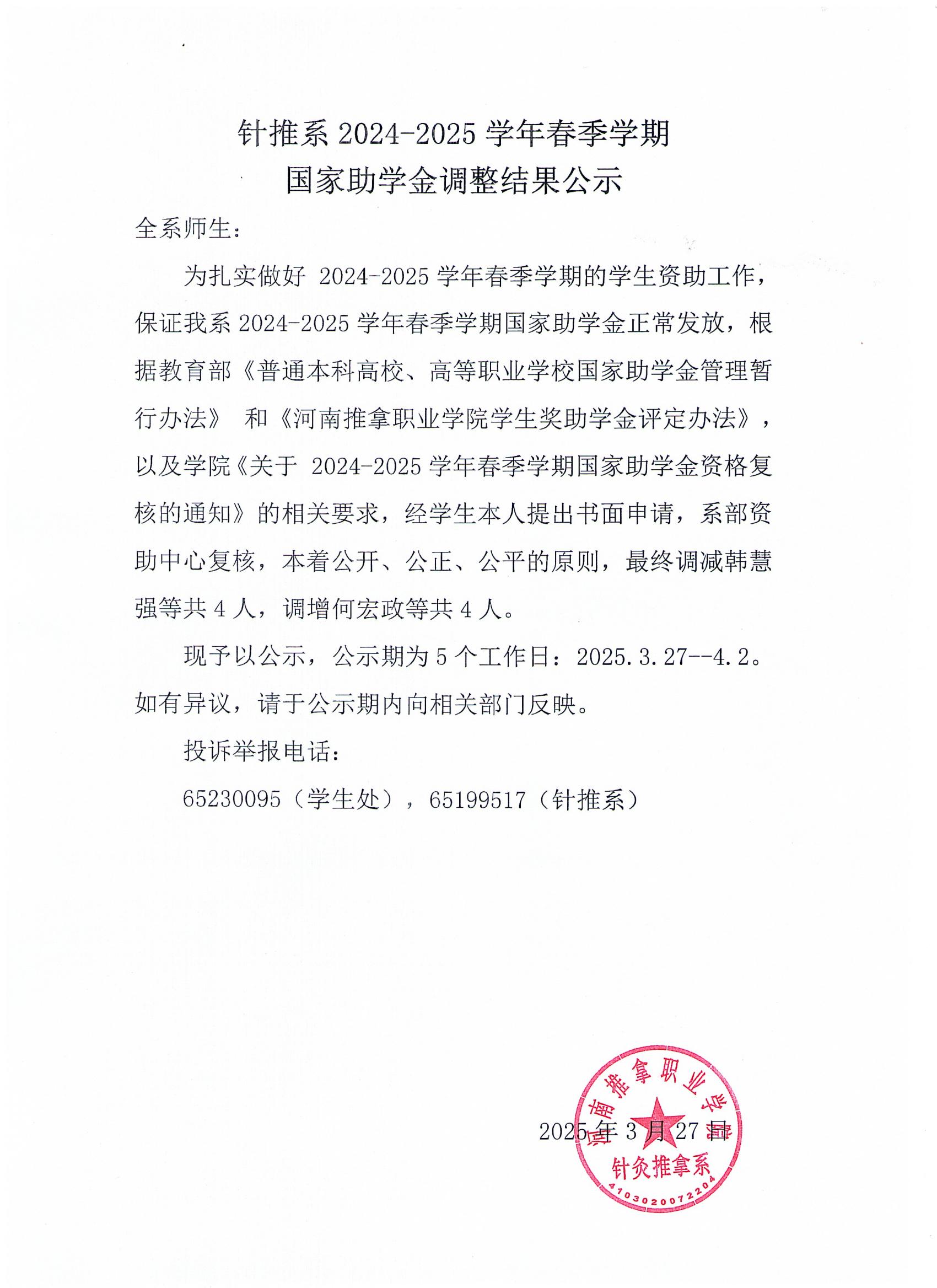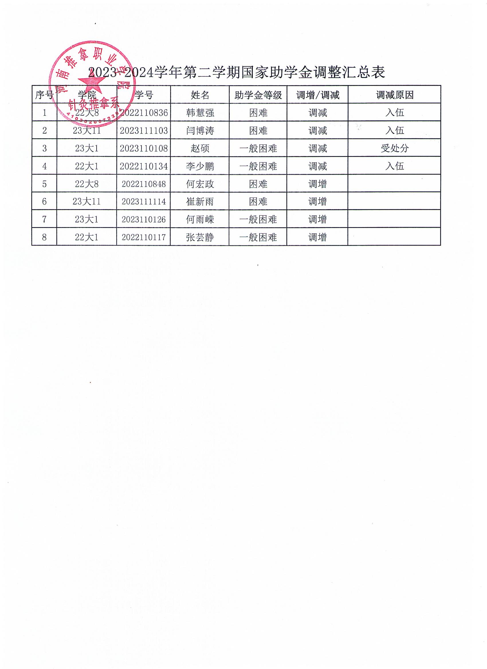 针推系2024-2025学年春季学期国家助学金调整结果公示
