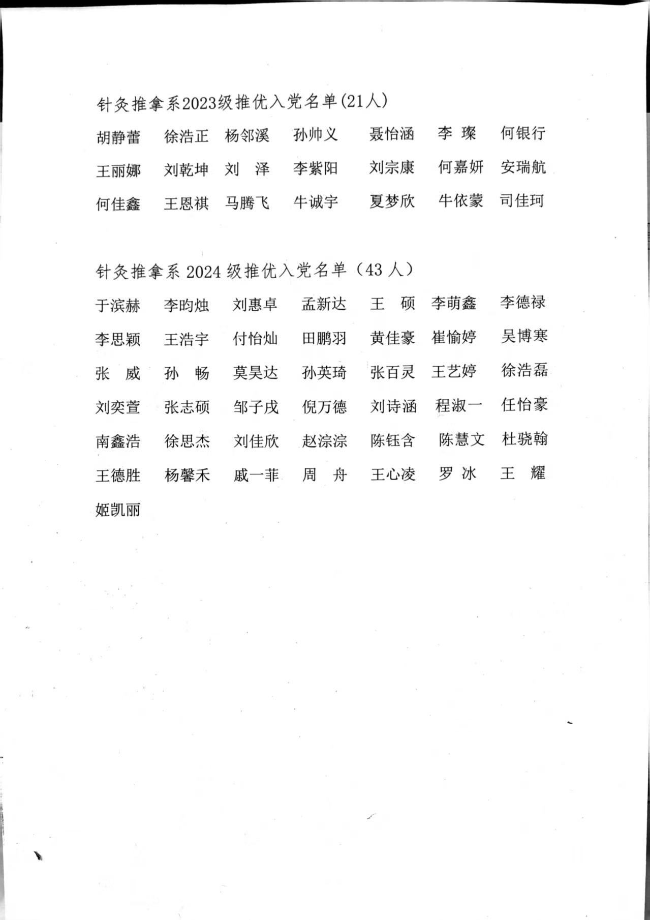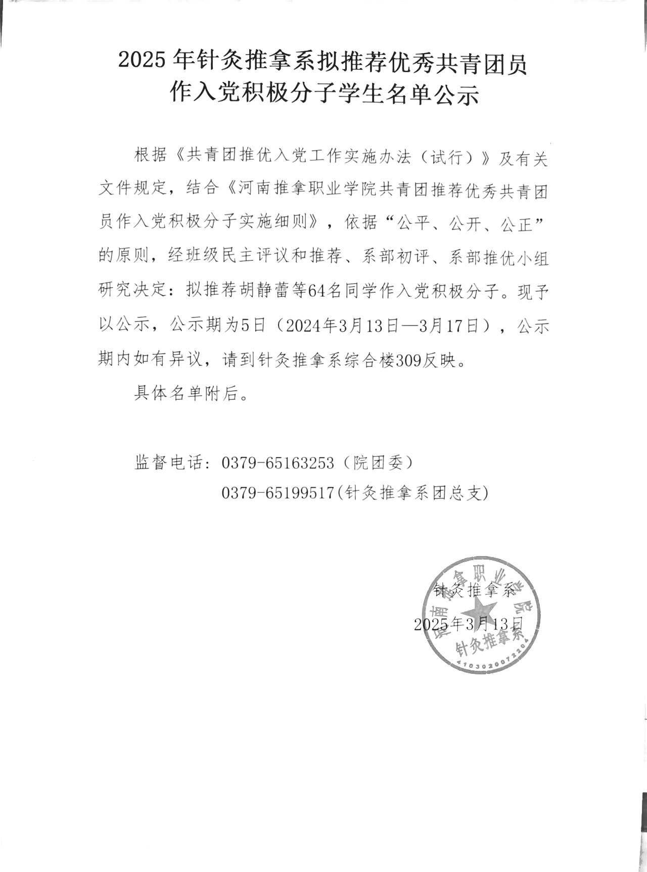 2025年针灸推拿系拟推荐优秀共青团员作为入党积极分子学生名单公示