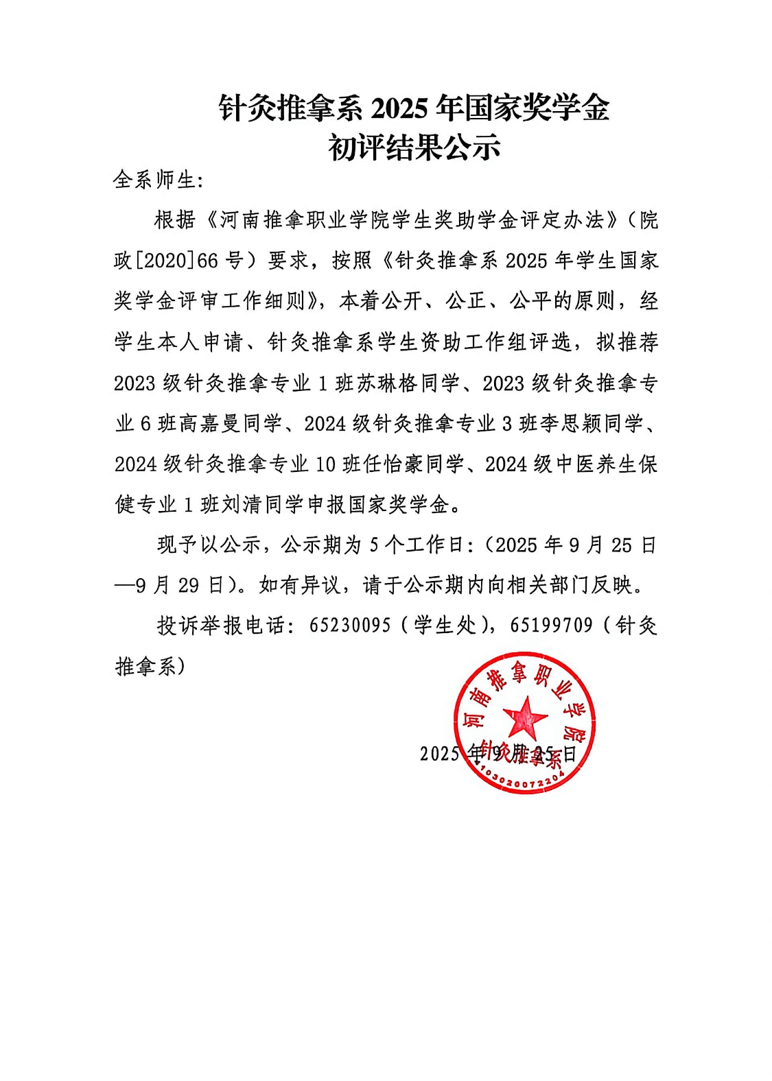 针灸推拿系2025年国家奖学金初评结果公示