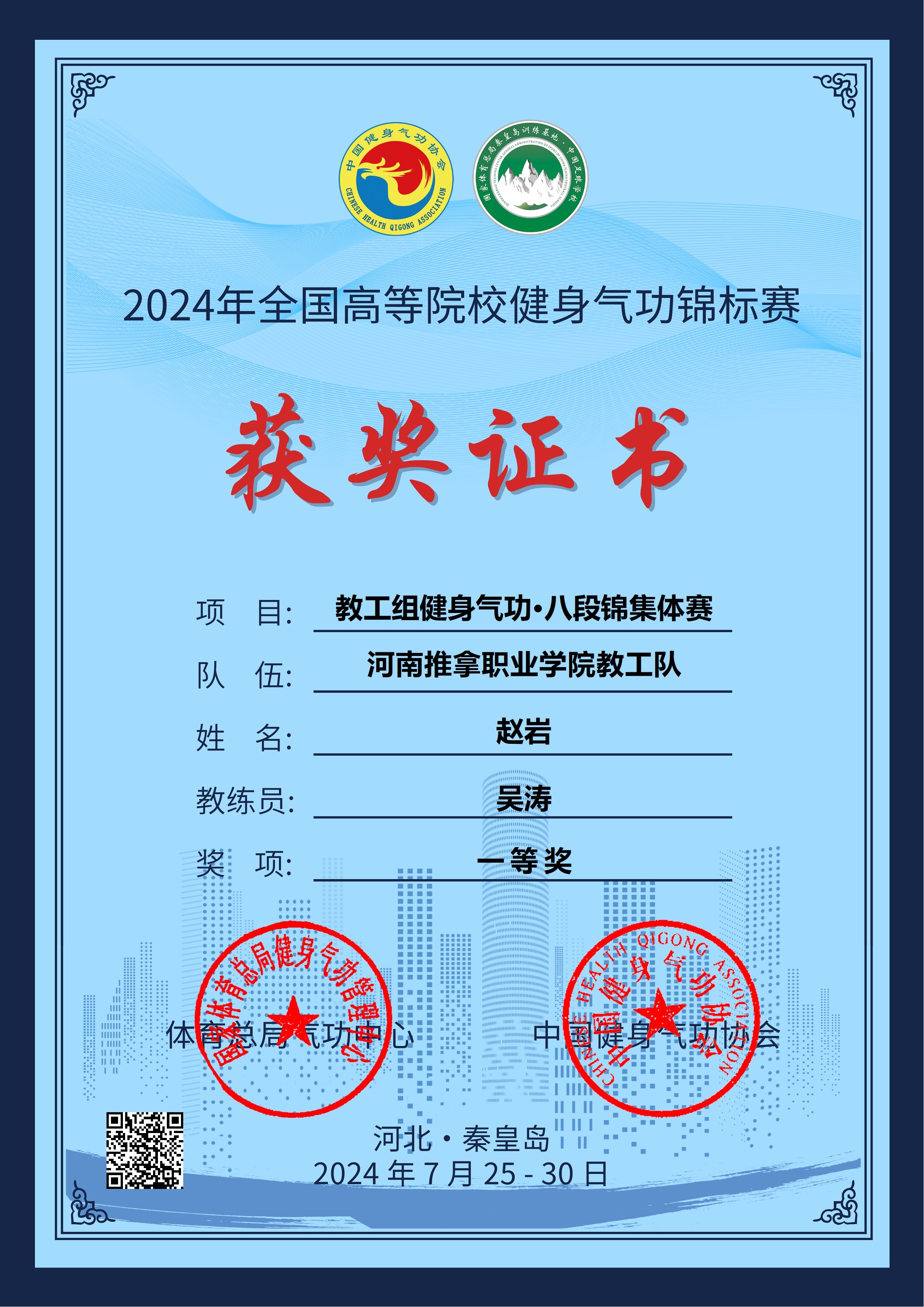 全国高等院校健身气功锦标赛八段锦集体赛一等奖
